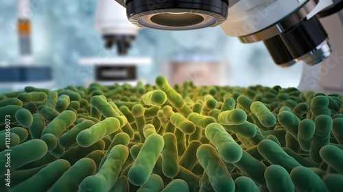 Microscopic view of beneficial bacteria thriving in a healthy environment, symbolizing the importance of microbiome balance in maintaining overall well-being.