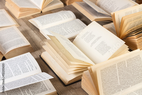 Libros abiertos sobre mesa de madera rústica. Vista superior