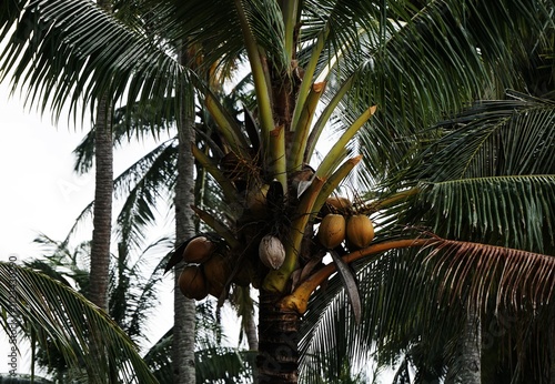 Świeże kokosy rosną na palmie. Palma z kokosami, liście palmowe i czubek drzewa. Woda kokosowa ze świeżego kokosa.