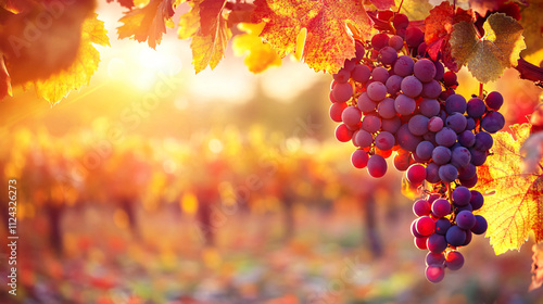 Wide view of autumn vineyard with colorful leaves and ripe grapes ready to harvest