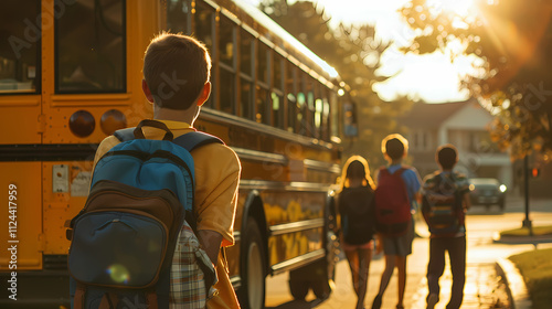 Golden Hour School Bus: A young student, backpack slung over his shoulder, walks towards a yellow school bus at sunset. Other children are visible in the background.