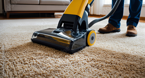 Odkurzanie dywanu, zbliżenie na odkurzacz - porządki domowe
