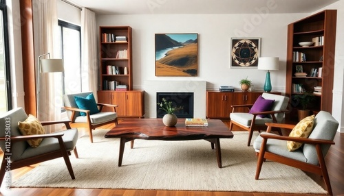 Mid century modern living room featuring a statement walnut coffee table, retro armchairs, angular wooden bookshelves, and bold colored accent pillows