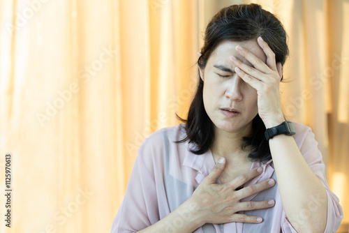 Asian woman experiencing symptoms of palpitations and dizziness,holding her chest,sensation of irregular heartbeat, feeling fatigued and lightheaded,symptoms of cardiovascular problem,heart issues