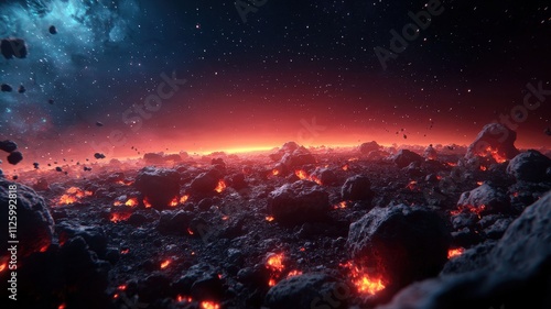 Asteroid mining concept. Vivid alien landscape with glowing lava and starry sky in the background.