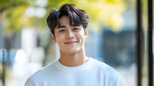 Handsome japanese man, young asian model smiling, casual lifestyle portrait, korean look, male adult exudes happiness, attractive guy with cool demeanor, chinese style.