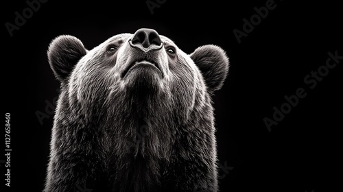 Front-facing Kamchatka bear portrait, high contrast black-and-white, powerful expression, sharp details, isolated against a pure black background