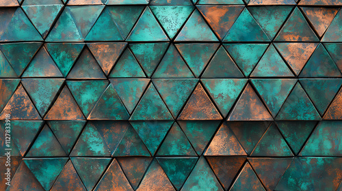 Seamless triangle mosaic copper texture with verdigris patina symmetrical. Verdigris. Illustration