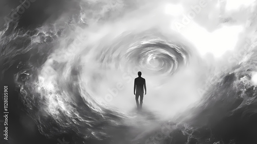 A lone figure, standing amidst a swirling vortex of steam, appears to melt and dissolve, creating a fleeting and illusory image. Illusory. Illustration