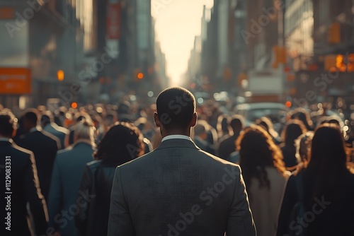 Man Walking City Street Rush Hour Sunlight