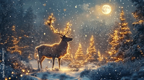 This enchanting Christmas banner showcases a majestic reindeer in a snowy landscape, surrounded by illuminated trees and twinkling stars, with space for text.