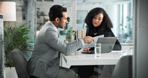 Business, people and meeting with documents in office for reading report, financial update and teamwork. Man, woman and laptop with investment feedback, review budget and planning schedule of project