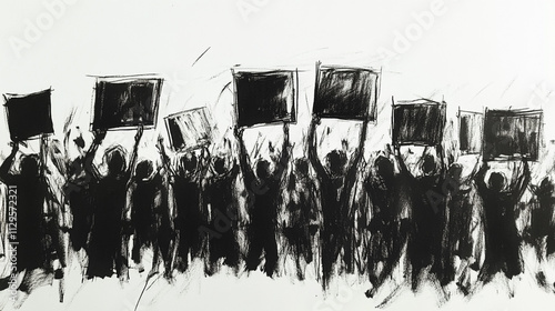 Protest Crowd Demonstration People Raising Signs Black and White Art Ink Drawing Soci