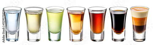 a round of party shots collection: vodka, tequila, green tea, rum, liquor, jager, b-52, transparent glasses overlay