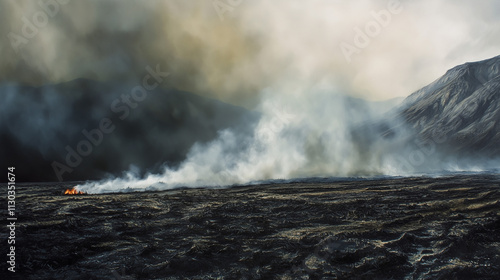 Kłęby dymu wznoszą się nad wypaloną ziemią, symbolizując powagę zniszczeń i transformacji środowiska.