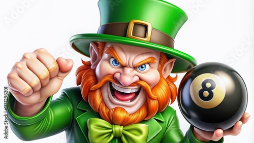 A furious leprechaun billiards mascot grips an 8 ball, displayed in vibrant colors. The panoramic scene captures the whimsical character's intensity and playful spirit in action.