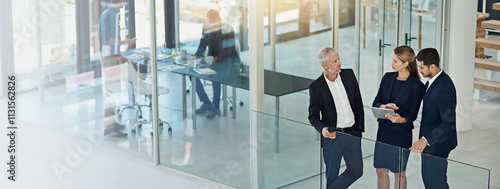 Banner, above and planning with business people and tablet in office for teamwork, investment banker or advice. Online, budget proposal and network with employees in financial firm for company equity