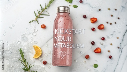 A photogenic bottle filled with a sparkling elixir stands alone on an elegant marble surface. The phrase Kickstart Your Metabolism is embossed in striking letters reflecting