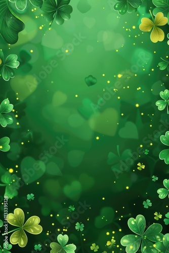 vertical banner, St. Patrick's Day, scattering of clover leaves, abstract bright green background, bokeh effect, shine and radiance, copy space, free space for text
