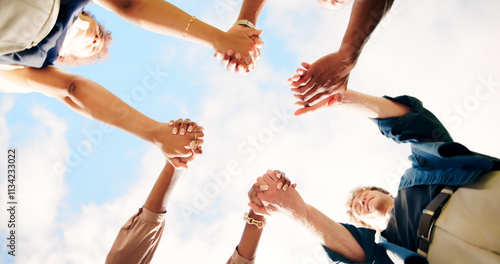 Friends, people and holding hands outdoor for teamwork, synergy or solidarity by sky. Group, support and community of students in circle for cooperation, association or collaboration at college below