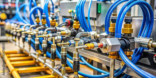 A complex arrangement of plumbing components is visible in a manufacturing facility. Multiple blue hoses intertwine with valves and fittings, showcasing an intricate plumbing system