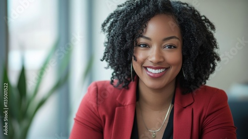 A portrait of an eminent, successful African American businesswoman smiling, wearing an orange suit jacket and blouse, with styled, natural, curly hair, sitting in an office