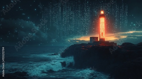Retrostyle poster Morse code overlaid an image of a lighthouse sending light signals across the sea deep blue hues