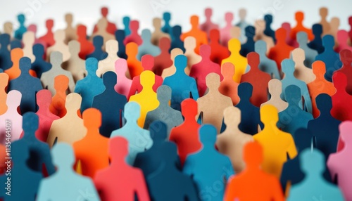 Digital collage illustration shows diverse crowd of paper cut-out people. Silhouettes various colors, poses. Colorful figures create dynamic, vibrant composition. People of many different