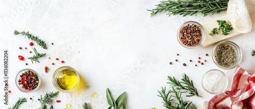 Aromatic Herbs, Spices, and Olive Oil Culinary Flat Lay Photography