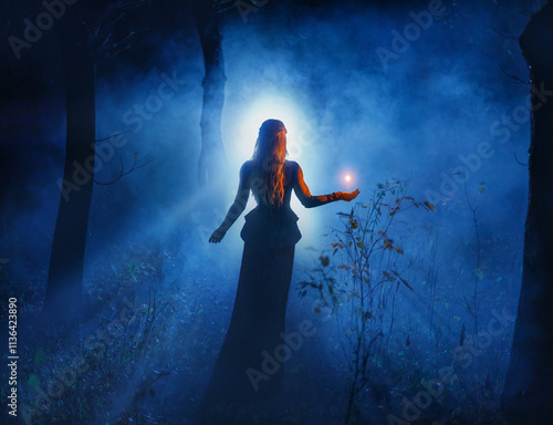art photo real person beautiful fantasy woman holding magic light in hands, glowing ball fly in air illuminates way in dark night forest fog tree. Girl elf magician sexy dress. mystic lady sorceress