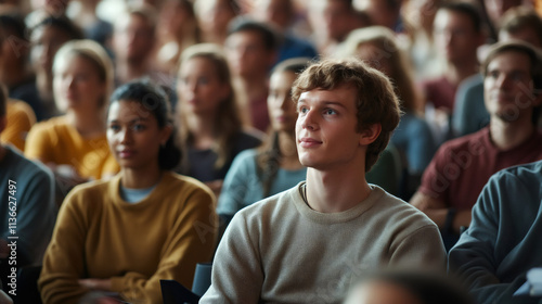Varied group of students paying close attention in a university lecture hall, actively participating in the educational discussion