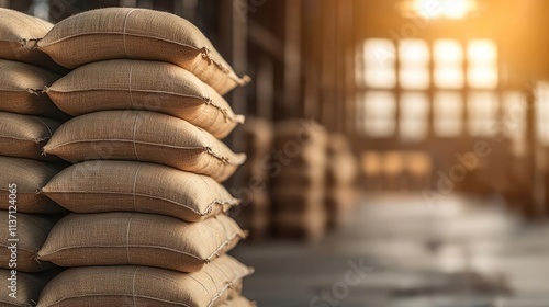 Wheat sustainability concept. Stacked burlap sacks in a sunlit warehouse, showcasing storage and logistics.