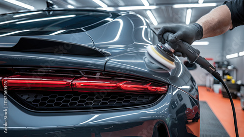 Close-Up of Car Rear Highlighting Sleek Design and Vibrant Red Tail Lights, Black-Gloved Hand Polishing with Tool, Shiny Surface in Professional Car Detailing or Polishing Session Ambiance