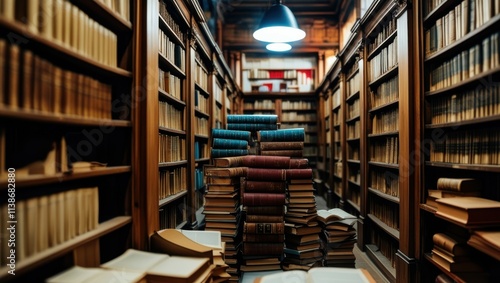 old library, rows of bookshelves, wooden ladders, antique books, warm lighting, arched ceiling, cozy atmosphere, narrow aisle, leather-bound tomes, scholarly ambiance, historic archives, dusty volumes