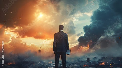 A business executive standing outdoors, looking out at multiple natural disasters approaching, including a flood, wildfire, landslide, and heavy smog from air pollution.