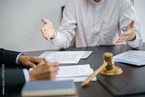 Legal counsel presents to the client a signed contract with gavel and legal law. justice and lawyer concept