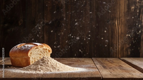 Bread and pastry powder on a wooden table and space for text input