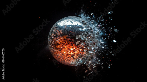 A disco ball explodes into pieces, breaking into tiny mirror pieces in a dramatic explosion. The ball drops at new year. Party or celebration theme. Isolated on black background.