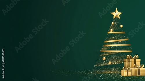 Elegant Golden Christmas Tree Ornaments with Gifts on Deep Green Background