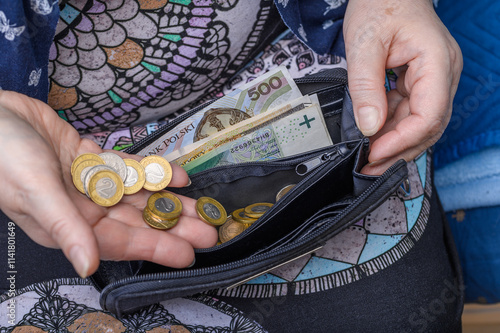 Starsza pani wyciąga gotówkę z portfela, renta socjalna i pensja minimalna