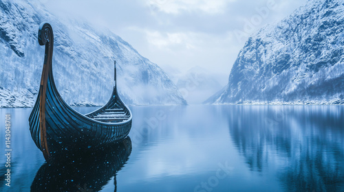 Wśród zaśnieżonych gór skandynawskiego fiordu znajduje się wikingowski statek, który wprowadza w atmosferę dawnych podróży i zimowego krajobrazu.