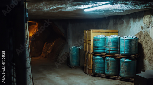 Stosy materiałów wybuchowych ułożone w słabo oświetlonym podziemnym tunelu.