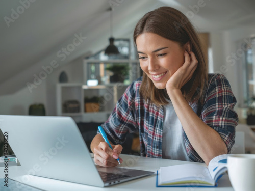 Mujer joven con una computadora portátil sentada en un escritorio. Ella está escribiendo notas mientras mira un seminario web. La mujer está estudiando en línea, aprendiendo clases web o teniendo una