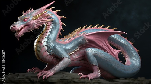 A majestic, pink and blue dragon with gold accents, perched on a dark rock against a smoky background.