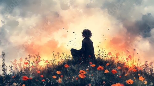 Watercolor painting of a poet sitting on a hill at sunset with verses forming in the clouds for World Poetry Day