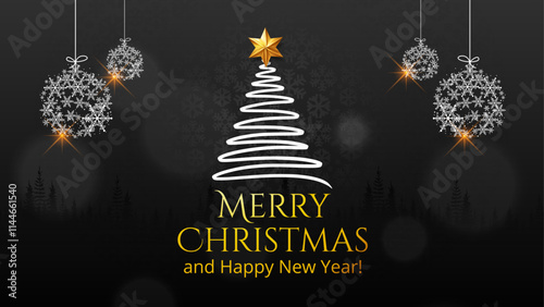 Christmas card with Christmas tree Digital Web banner Background, Snowflakes, Star, Balls. Christmas Social media post, Flyer, Banner. Happy Holiday, Website Banner, Editable Marry Christmas Text