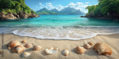 Wakacje nad morzem - błękitna woda i piasek na plaży z muszlami
