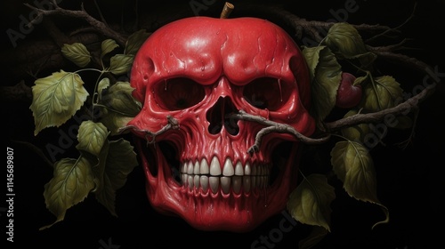 Red skull adorned with fruit and foliage, symbolizing the contrast between life and death, evoking a surreal and artistic theme.