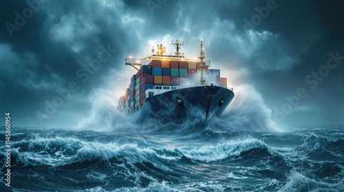 Large Cargo Ship Navigating a Harsh Stormy Ocean at Night