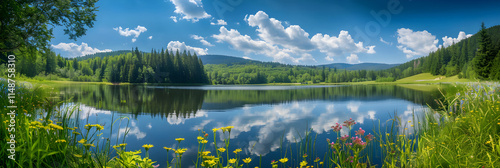 Tranquil Lake Surrounded by Forest with Wildflowers in Foreground and Rolling Hills Under a Clear Blue Sky with Fluffy Clouds